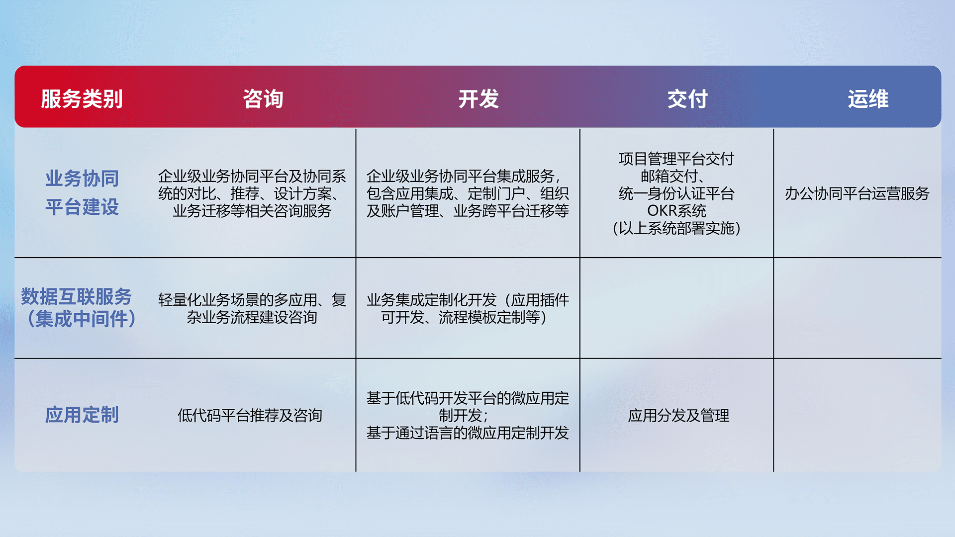 针对钉钉、、、企微、、、IDaas等平台级产品提供产品的规划、、、方案、、、、交付、、、定制化开发等服务,,,实现如统一协同办公、、、、智能客户服务、、、混合会议管理、、、、智能数据查询、、等业务场景,,,实现数字化转型。。